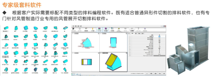 各種工業(yè)異形件加工;各種通風(fēng)管道彎頭切割加工(配合專用的風(fēng)管選型與編程軟件,輕松實(shí)現(xiàn)風(fēng)管切割加工),各種薄板金屬制品的切割加工(如:不銹鋼廚具、炊具),廣泛應(yīng)用于各個行業(yè)的金屬薄板切割加工。